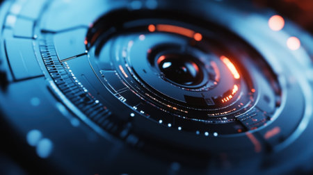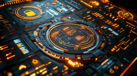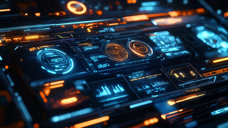 A close-up view of a futuristic interface with glowing orange lights and digital displays.
