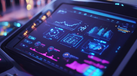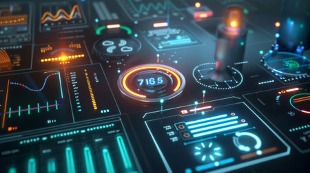 A close-up view of modern digital user interface elements featuring interactive graphs, sleek buttons, and control panels. Ideal for technology and design projects.
