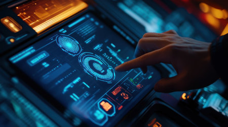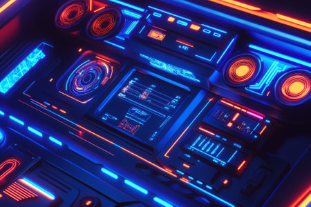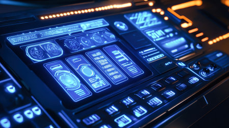 A sleek control panel with a holographic interface illuminates the dark space with vibrant neon blue lighting, showing advanced futuristic technology and intricate details.