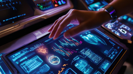 Futuristic digital interface displaying various data analyses in a high-tech environment