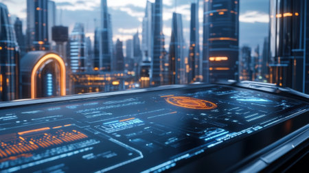 Futuristic control panel monitoring smart city infrastructure at dusk