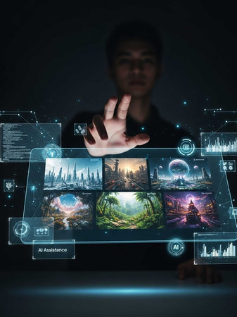 Man using holographic screens with AI assistance
