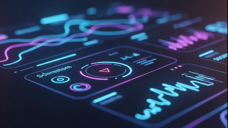 Close up of a digital user interface featuring neon style graphs, controls, and data visualizations on a dark background
