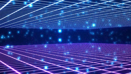 Abstract perspective grid. Digital background in retro style. Wireframe cyber landscape on blue background. 3d rendering.