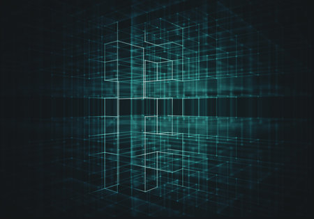 Digital blockchain concept and data transfer system. Abstract wireframe cube whith connection dots and lines. Storage cells of datas. 3d rendering.