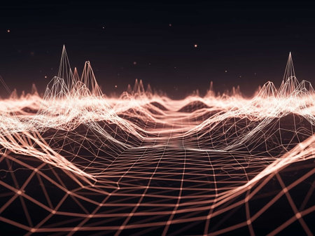 Abstract Futuristic 3d Render Illustration. Plexus polygonal background. Wireframe landscape concept. Dark sci-fi backdrop. Dots and lines connections. Space surface. Big data macro wireframe.