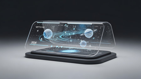 A transparent futuristic display case a holographic projection of planets and star systems on a...