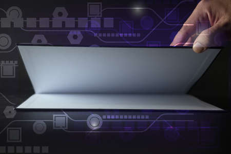 Multi exposure of man's hand holding and using a digital device and data theme drawing. Innovation concept.
