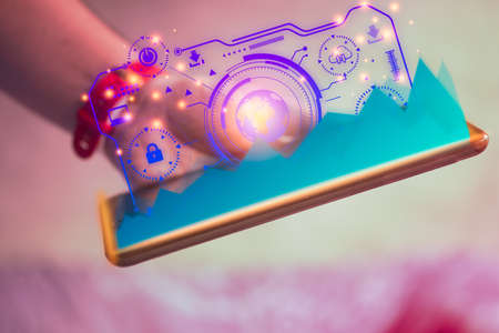 Double exposure of creative hologram and woman holding and using a mobile device. Start up concept.
