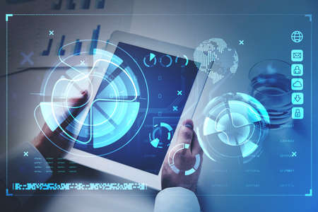 Double exposure of man's hand holding and using a digital device and data theme hologram drawing. Technology concept.