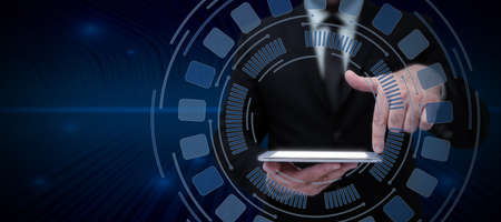 Close up of man hands holding tablet with the dashboard is big data for world wide technology, upload, download and protect a data. System engineering and digital transformation concept.