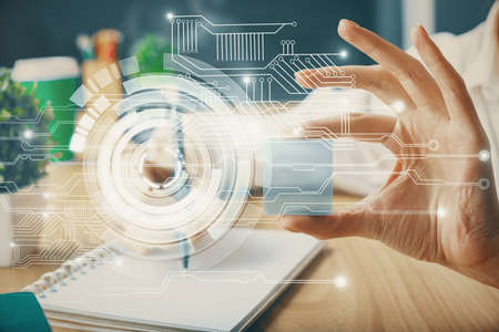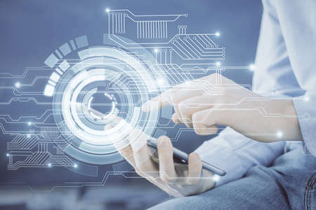 Double exposure of technology sketch hologram and woman holding and using a mobile device. Ai concept