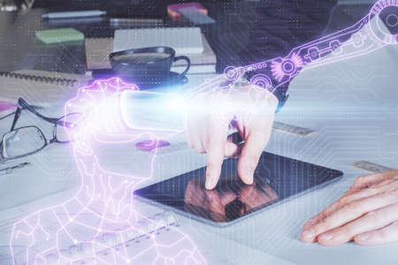 Double exposure of man's hands holding and using a digital device and AR glasses drawing. Virtual reality concept.