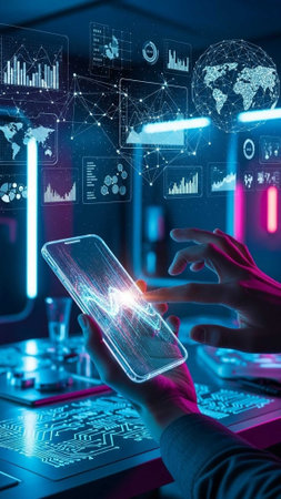 Smartphone showing woman in futuristic armor holding smartphone with glowing holographic...