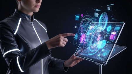 Technology showing woman engaged with advanced digital holographic display showing complex data...