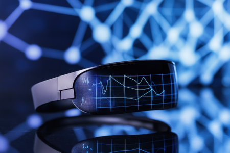 Wearable device shows data metrics against a digital, interconnected backdrop in a modern setting.