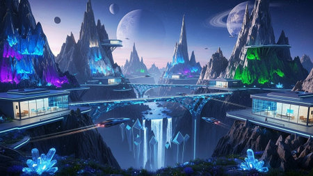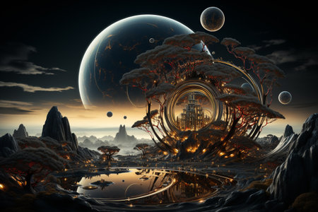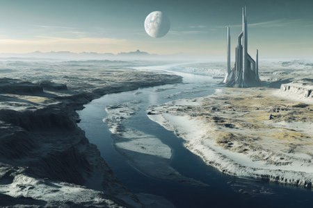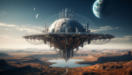 Futuristic sci fi landscape featuring fantasy industrial structures and celestial bodies in the sky