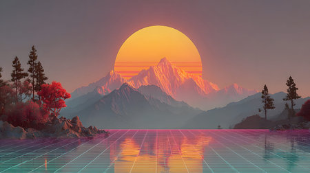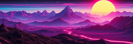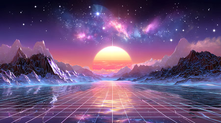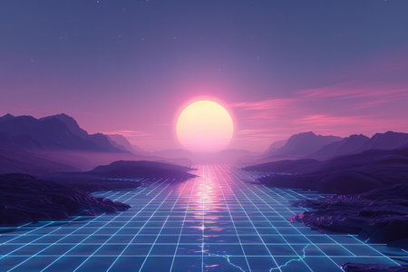 Retro Wave Landscape with Neon Grid and Mountain Range