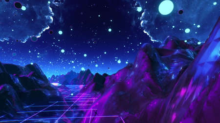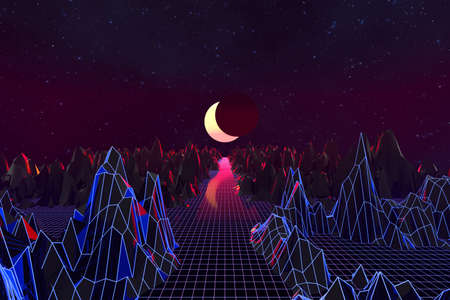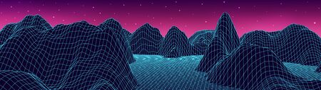 80s retro futuristic city background abstract grid landscape design. Game 3D rendering illustration of dark purple pink neon light galaxy space with horizon mountain of the 1980`s.