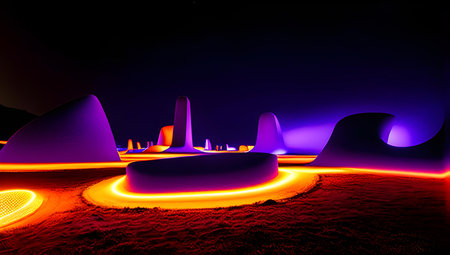 Abstract landscape with neon purple and orange light trails under a night sky.