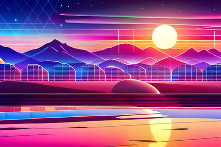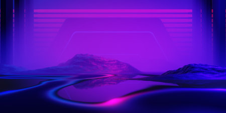 80s retro futuristic sci-fi background. VJ videogame landscape with neon lights