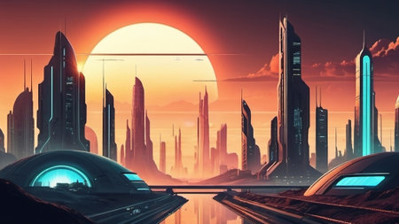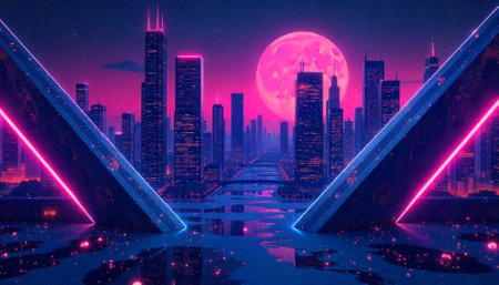 Futuristic cityscape with a full moon and neon accents