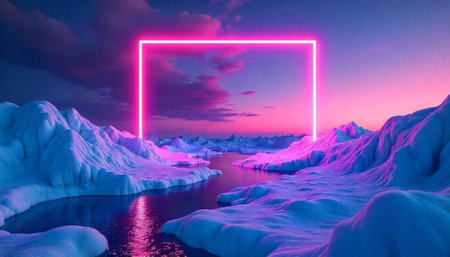 Neon rectangle over icy landscape with surreal pink light