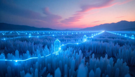 Crystal field landscape with connecting lines and sunset sky