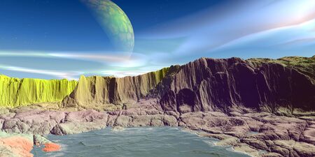 Fantasy alien planet. Mountain and sea. 3D rendering.