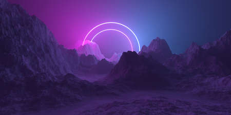 Mountain terrain landscape with two pink and blue glowing neon light round circle frames, retro technology or futuristic alien background template, 3D illustration