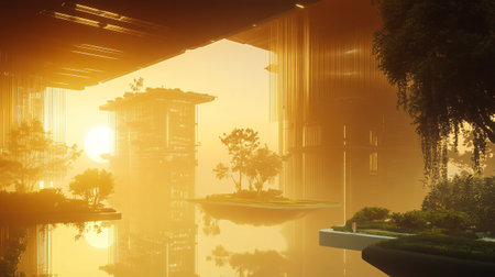 Unique futuristic structures stand tall above calm water, beautifully reflecting the vibrant colors of sunset.