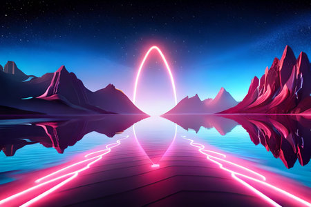 Neon Portal Landscape with Mountains, Lake and Starry Sky