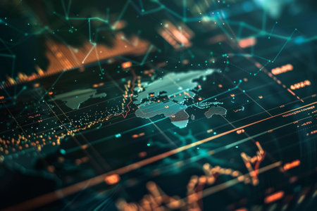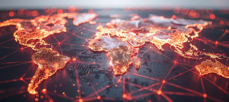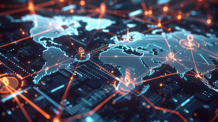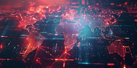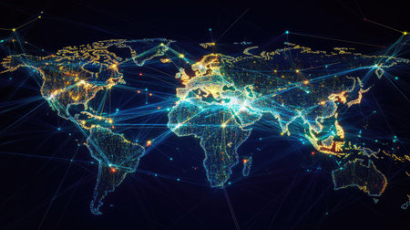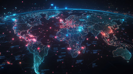 This striking visualization showcases a detailed map of the world, enhanced by glowing network connections and digital elements, symbolizing global connectivity.