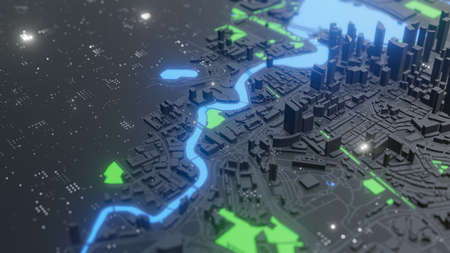 A high-tech city map display showcasing intricate data visualization, perfect for urban analysis and planning. This futuristic graphic illustrates the landscape's connectivity and growth.