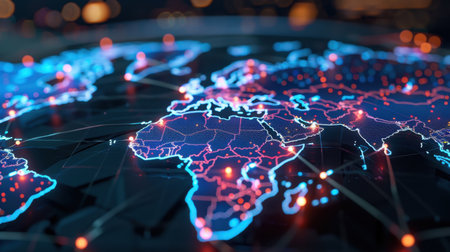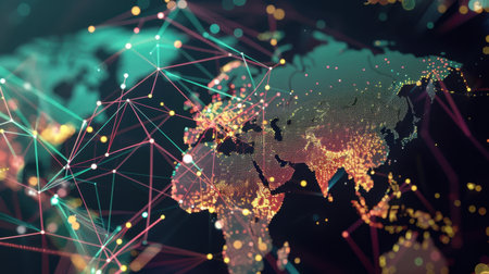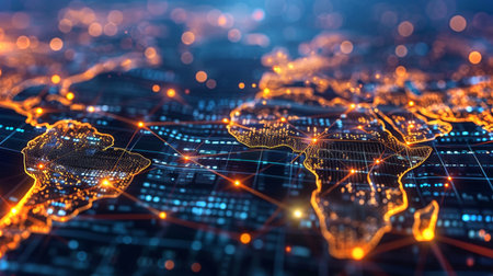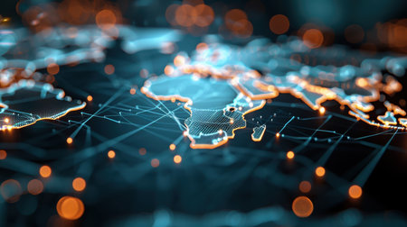 This abstract image showcases a digital network representation of geographic regions, highlighting global connectivity and data exchange.