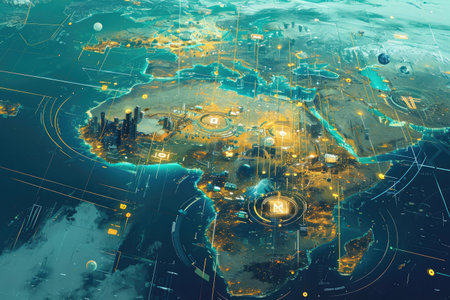An interconnected web of digital currency transactions spanning across continents and nations represented by a network of pulsating nodes