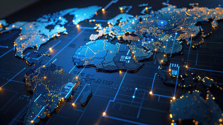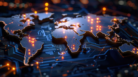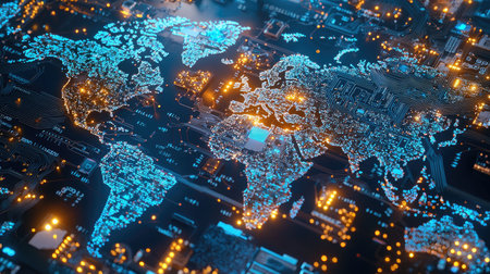 Explore a stunning digital world map featuring intricate circuit patterns and illuminated data points, representing global connectivity in a modern technology landscape.