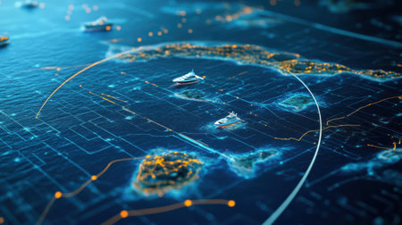 Boats can be seen navigating a vibrant digital map, displaying illuminated waterways and coastal areas at night, highlighting connectivity and maritime activity