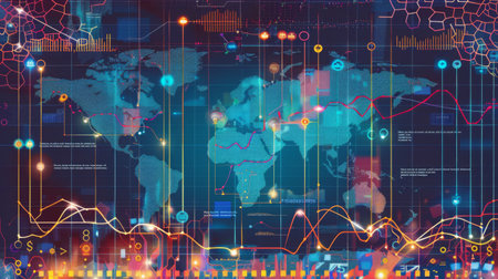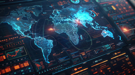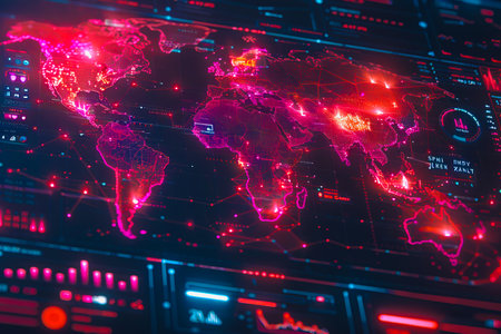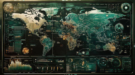 World map with a futuristic touch, featuring technological data overlays and graphs