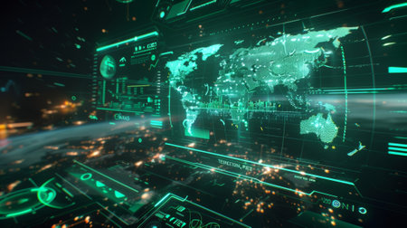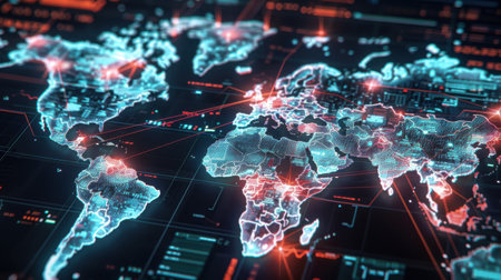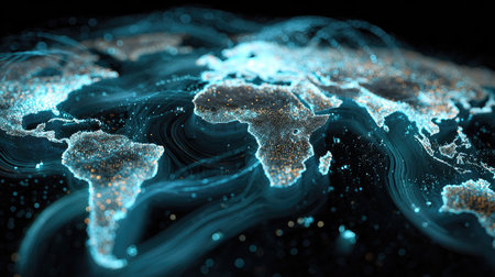 Detailed map representation highlights continents and oceans with glowing lines in a dark background, showcasing a modern digital aesthetic.