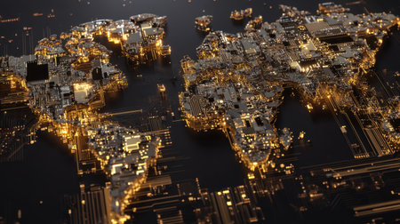 Close-up view of a world map crafted from microcircuits, reflecting digital technology and global networks with stunning detail and color enhancement.