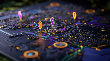 A stunning digital representation of a map showcasing vibrant location markers in a bustling urban environment illuminated at night, perfect for tech and travel themes.