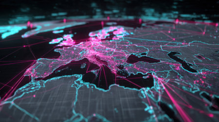 Discover a captivating digital rendering of Europe, showcasing glowing network connections and data visualization. Perfect for technology themes.
