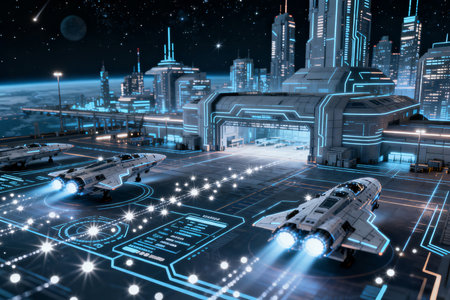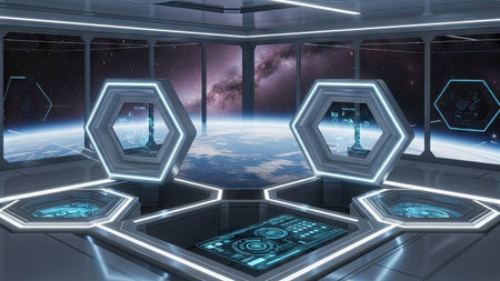 A sleek, modern space station interior showcases stunning views of Earth, with high-tech consoles and bright lights.