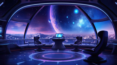 A Futuristic design of a spaceship interior with panoramic windows offering a breath-taking view of space.