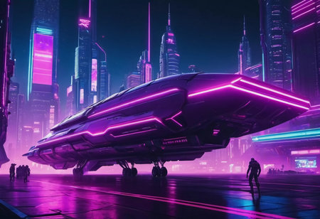 Cyberpunk Futuristic space ship. Logistics of the future, modern retro wave technologies With neon backlight contours, cyberpunk city view.