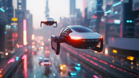 Futuristic autonomous flying electric taxi cab hovering above illuminated cityscape at sunset