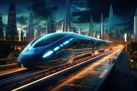 An illustration depicts futuristic high-speed trains moving through a modern city at night. The scene showcases illuminated skyscrapers, and an overhead perspective. The artwork's style is digital and suggests concepts such as transportation, infrastructure, and urban development. Suitable for a range of commercial applications.