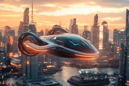 Futuristic flying car hovers above city skyline with glowing lights. Sunset setting enhances urban landscape with modern architecture.
