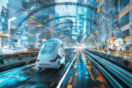 Futuristic, autonomous, driverless train utilizing sustainable energy sources, showcasing advanced transportation technology in a smart city environment